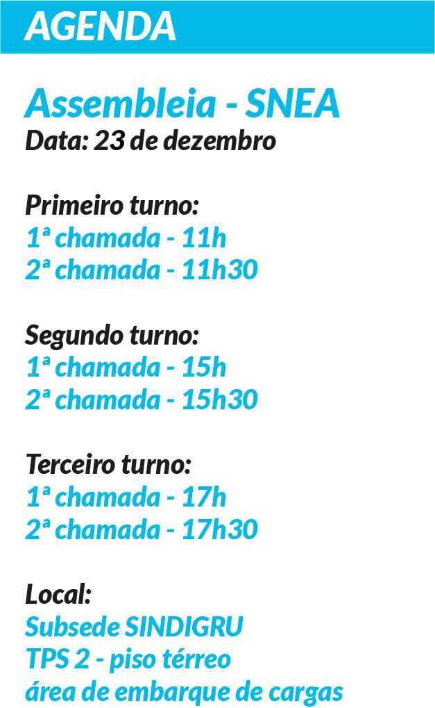 A assembleia discutirá nossa Convenção e Acordos Coletivos para propostas realizadas pelo SNEA, sindicato patronal responsável pelas companhias aéreas e pelas propostas realizada pelas companhias Gol e Azul, que fizeram adições particulares aos interesses das companhias mas em alinhamento às negociações junto ao SNEA.
