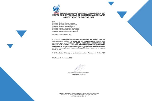 A Federação Nacional dos Trabalhadores em Aviação Civil (FENTAC) informa seus associados sobre a assembleia geral ordinária de prestação de contas 2024, conforme prevê o art. 44 de seu Estatuto Social, que acontecerá de forma virtual no dia 25 de junho, às 14h, através da plataforma Google Meet.