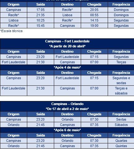 As rotas ligam o destino paulista à capital portuguesa, Lisboa, que receberá um voo semanal entre abril e maio, e Orlando, nos Estados Unidos. A outra base da Azul nos Estados Unidos, Fort Lauderdale, recebe um voo por semana em abril, mas, a partir de maio, terá duas frequências semanais. O esforço da companhia em garantir essas rotas internacionais permite o transporte de cargas importantes, como medicamentos e equipamentos, além do trânsito de clientes que precisem viajar.