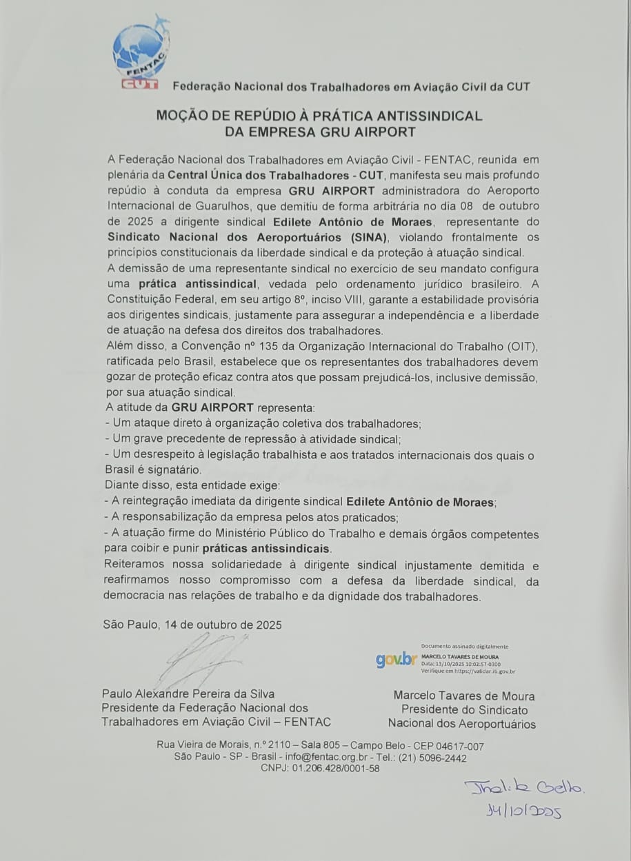 A moção, lida e protocolada por representantes do setor, denuncia que a dispensa da dirigente demonstra um claro ato antissindical por parte da empresa que administra o Aeroporto Internacional de Guarulhos.