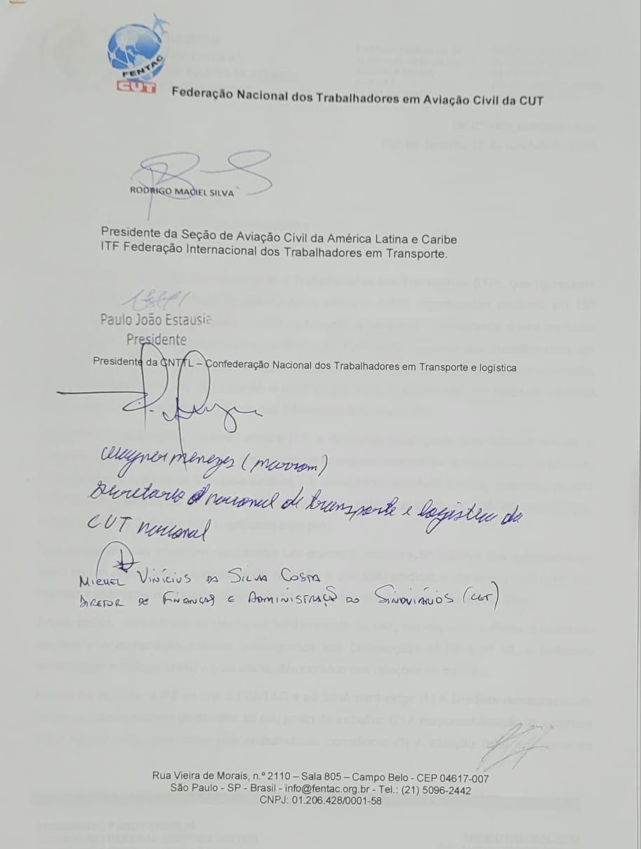 Importante frisar o apoio dos companheiros dos SINDIVIÁRIOS, Sindicato Nacional dos Aeroportuários, Confederação Nacional dos Trabalhadores em Transporte e Logística – CNTTL, Federação Internacional dos Trabalhadores em Transpote – ITF e a Secretaria Nacional em Transporte e Logística da CUT Nacional.