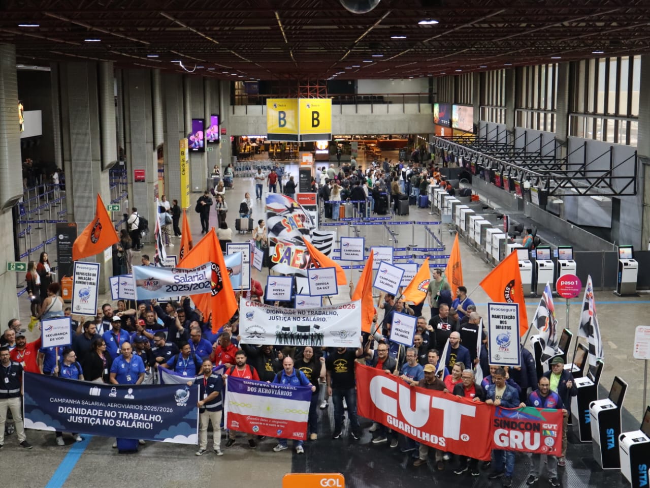 Os sindicatos dos trabalhadores aeroviários filiados à Fentac realizaram uma significativa mobilização no Aeroporto de Guarulhos nesta quinta-feira (2), com o objetivo de alertar as companhias aéreas quanto a capacidade de mobilização dos aeroviários para pressionar por avanços na Campanha Salarial 2025/2026, que tem como bandeira “Dignidade no Trabalho, Justiça no Salário!”