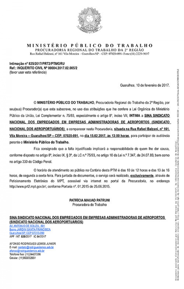Dirigentes do Sindicato Nacional dos Aeroportuários (Sina) e representantes do GRU Airport participam nesta quarta (15), às 13h, de audiência no Ministério Público do Trabalho da 2ª Região, em Guarulhos.