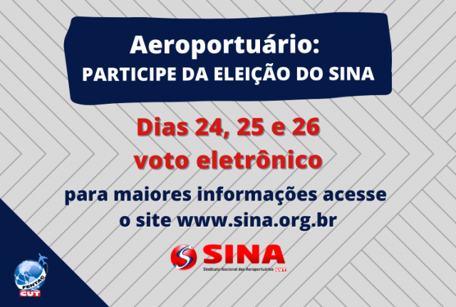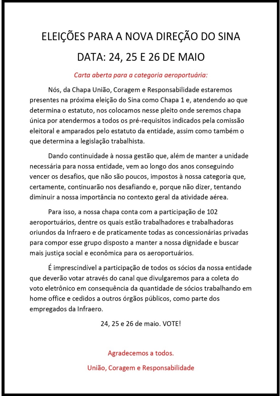 Nesta eleição do Sindicato Nacional dos Aeroportuários (SINA), a FENTAC dá o seu apoio para a Chapa União, Coragem e Responsabilidade, Chapa 1 e também única neste pleito da entidade.