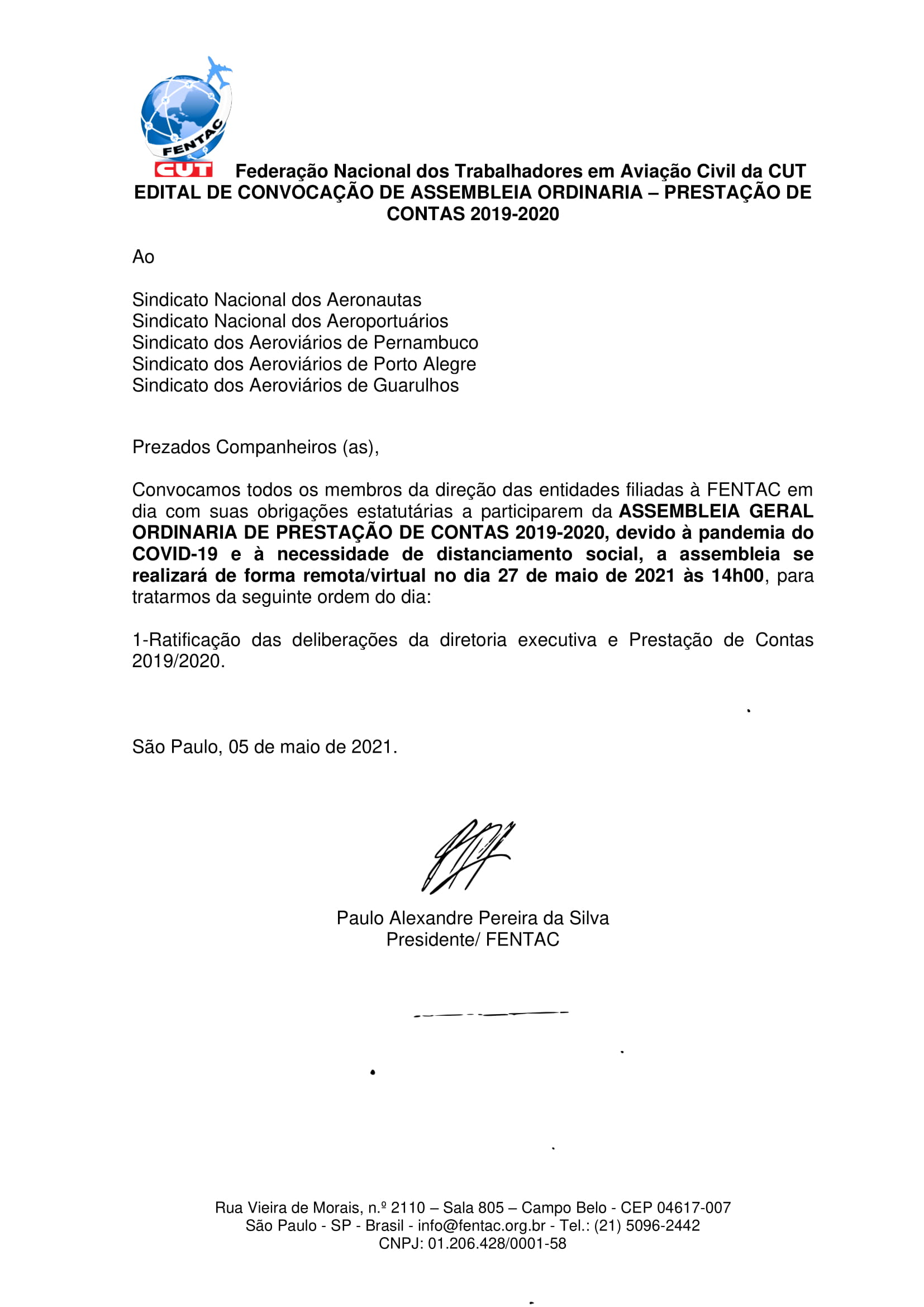 Para o próximo dia 27 de maio, uma quinta-feira, a FENTAC convoca todos os membros da direção das entidades filiadas para uma assembleia de prestação e contas dos anos 2019 e 2020. Dada a atual condição da pandemia no país e a necessidade de um distanciamento social, o encontro se dará de forma virtual, às 14h.