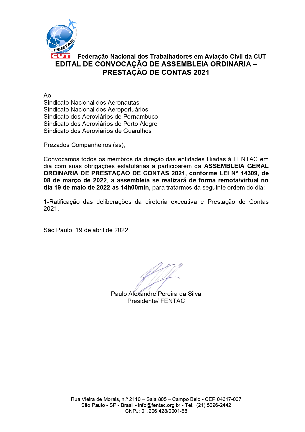 No próximo dia 19 de maio, às 14h, a Federação Nacional dos Trabalhadores em Aviação Civil (FENTAC) promove a Assembleia de Prestação de Contas da entidade. Estão convocados todos os membros da direção das entidades filiadas em dia com suas obrigações estatuárias.