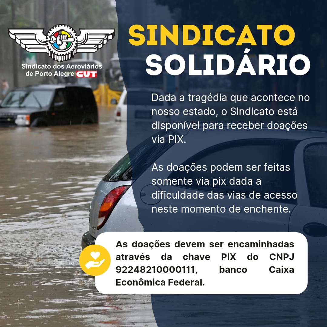 As doações podem ser encaminhadas via PIX do Sindicato dos Aeroviários de Porto Alegre, cnpj 92248210000111, Caixa Econômica Federal.