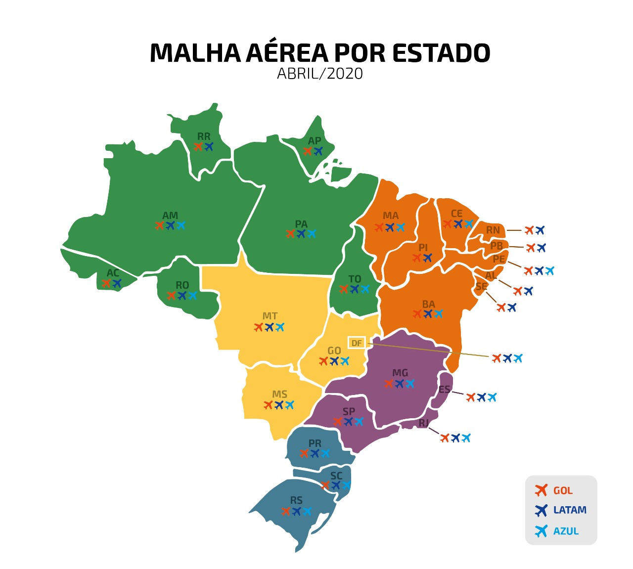 Veja no mapa a distribuição por região e confira no link os aeroportos atendidos por cada empresa.