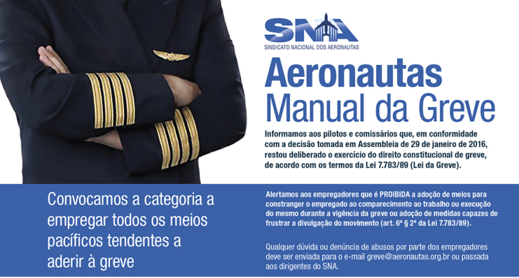 Para orientar os trabalhadores sobre a greve, o Sindicato Nacional dos Aeronautas (SNA) divulgou em seu site um manual orientando a categoria como se portar no dia 3 de fevereiro (quarta-feira), data que será realizada a greve nacional dos aeronautas e aeroviários.
